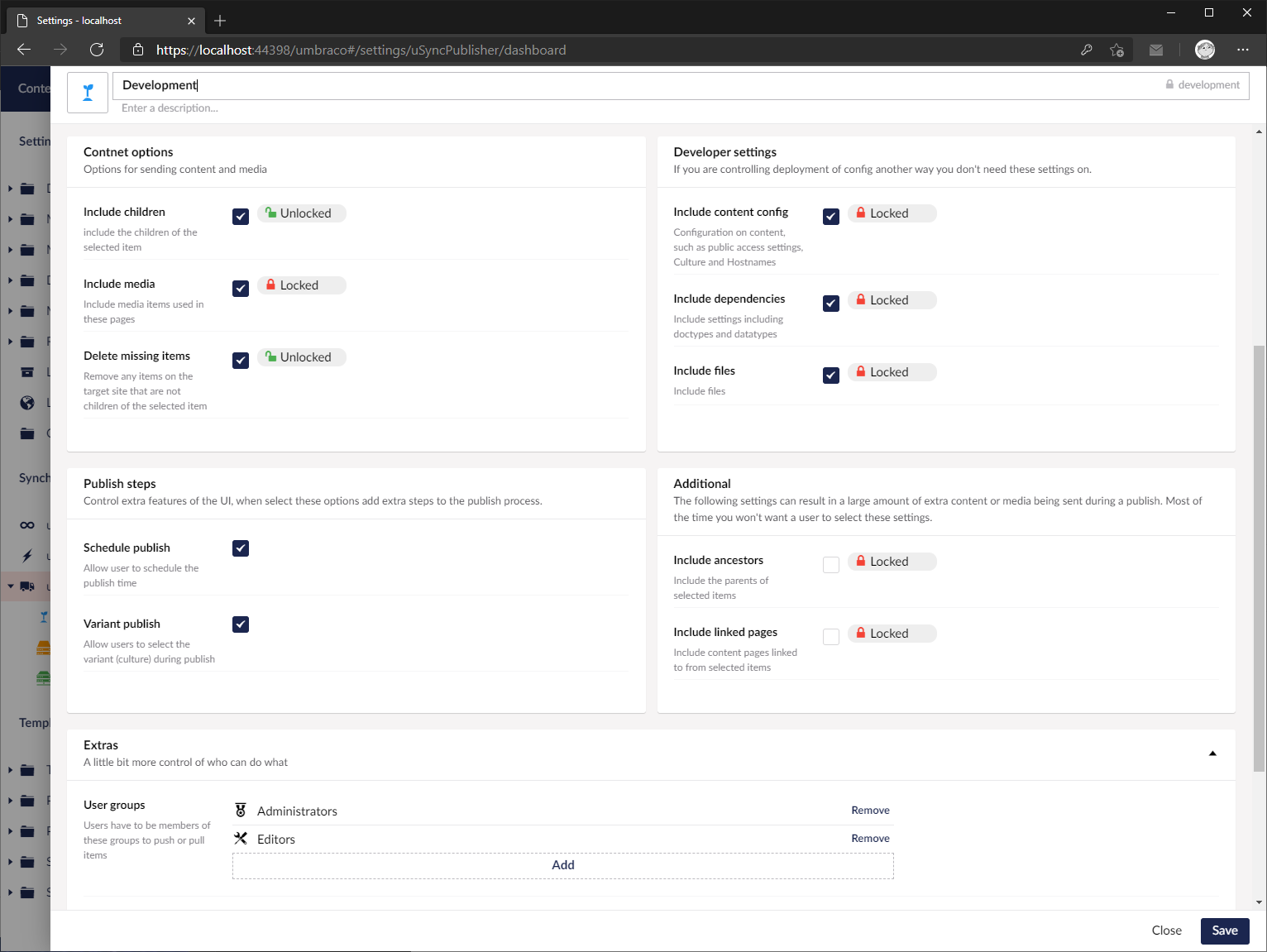 uSync.Publisher comes with a comprehensive set of configuration options. You can hide all the complexity from your editors whilst having full control over what and how content, media and settings are synced between sites.