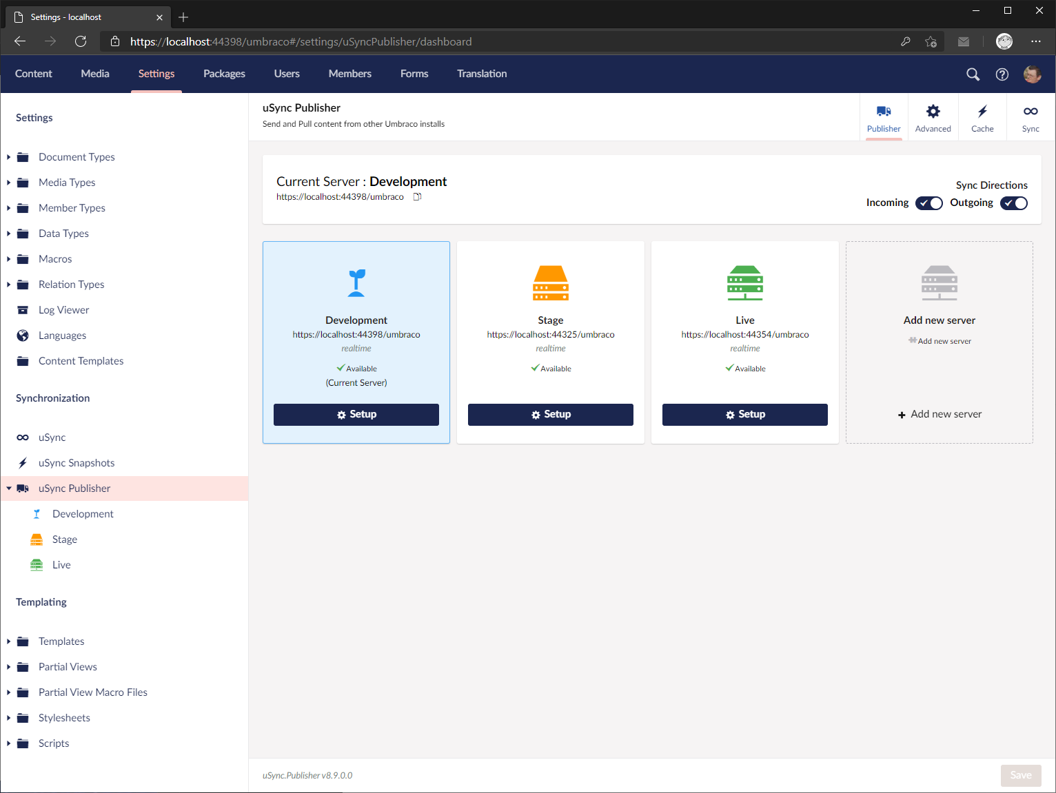 Keep all of your Umbraco site settings in sync, push changes to document types, macros, views and even system files, all from within Umbraco.