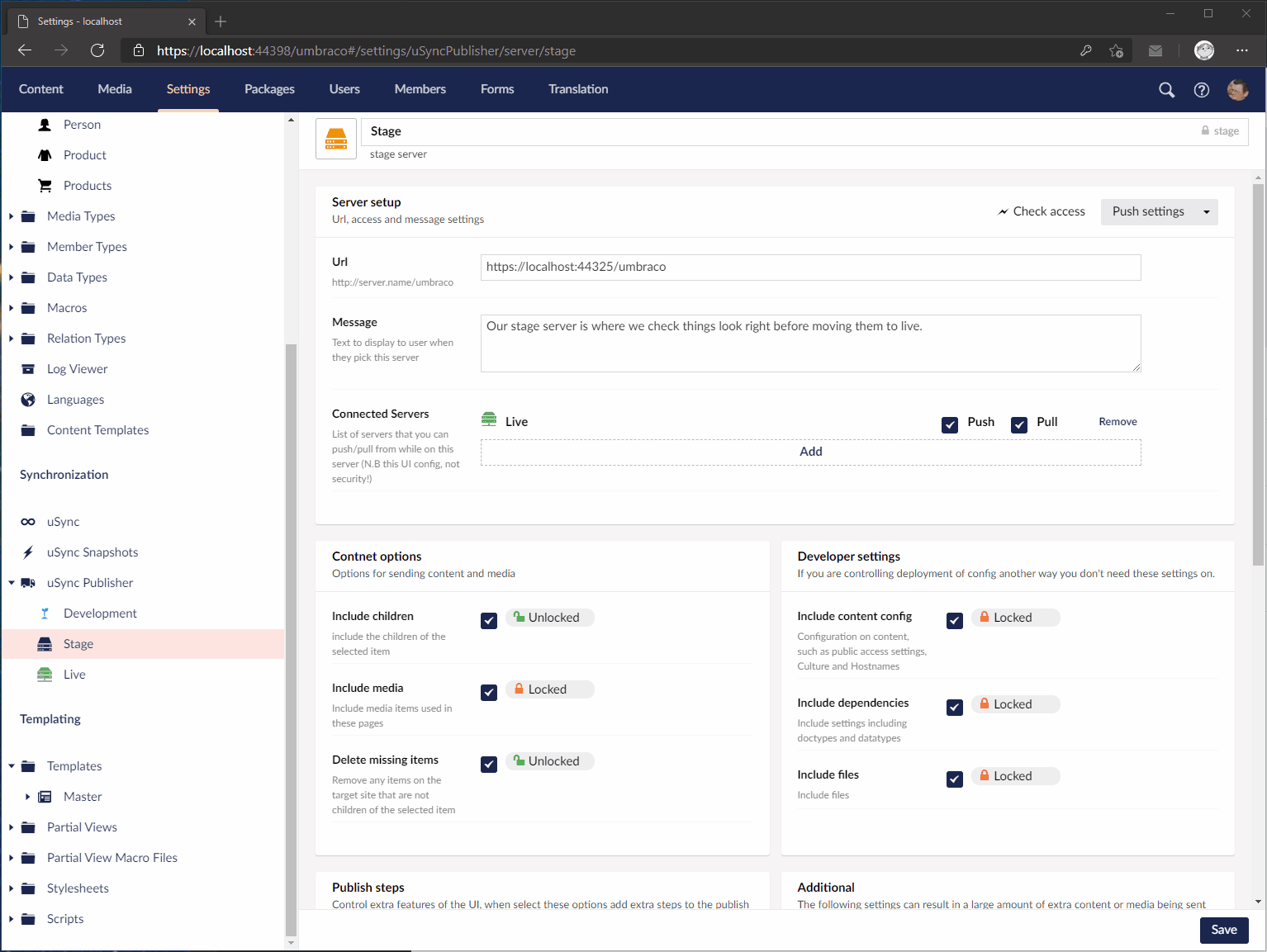 uSync.Publisher comes with a comprehensive set of configuration options. You can hide all the complexity from your editors whilst having full control over what and how content, media and settings are synced between sites.